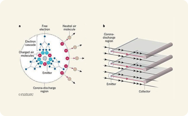 생성된 이온풍은 이온이 먼지 표면에 부착되어 하전된 먼지 입자가 방향성을 갖고 이동하여 반대 극성을 띠는 콜렉터에 포집되는 원리 적용