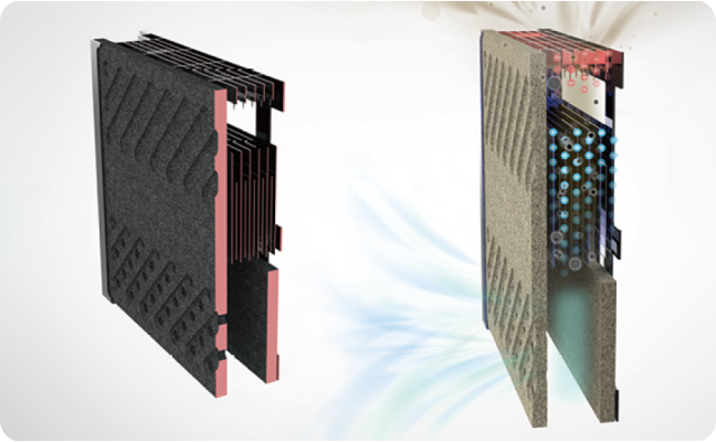 전면부는 흡음부로서 불연 고강도 흡음재로, 발생소음을 흡음하고, 내부 배후공기층과 함께 공명기와 같은 흡음구조로서 흡음성능이 향상되며, 동시에 타공된 부분을 통해 공기가 통하는 구조로 집진장치 성능을 배가하였습니다.