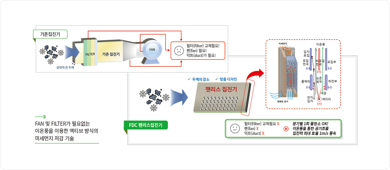 특수 설계된 에미터에 코로나방전을 유도하고, 발생된 이온이 이동하며 중성 공기분자와 연속충돌하여 설계된 방향으로 향하는 전기유체역학적 이온풍을 생성하는 집진부를 통하여 미세먼지를 포집합니다.