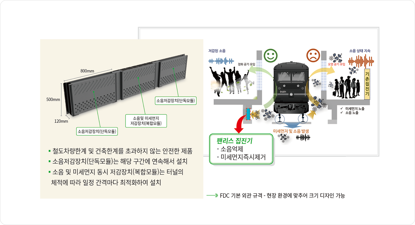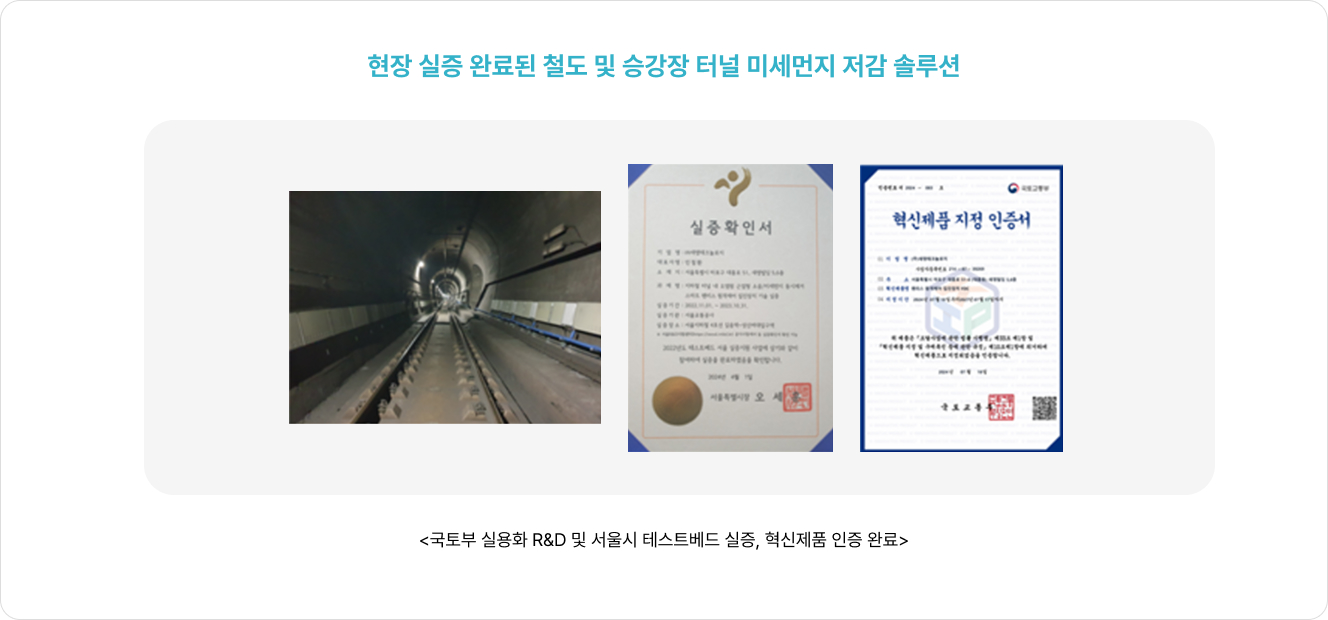 지하철 승강장 미세먼지의 주요 발생원인(승강장 PM10 78%, PM2.5 62%는 터널에서 유입) 터널 내 선로 근처에서 직접 미세먼지를 집진하여, 미세먼지가 승강장 내로 확산 유입되기 전에 가장 효과적으로 미세먼지를 저감시키는 장치. 동시에 선로에서 발생되는 소음 저감 성능도 지원하는 미세먼지 및 소음 동시 저감 가능한 최초의 장치 (2023년 대한민국 발명 특허대전 국무총리상 수상)